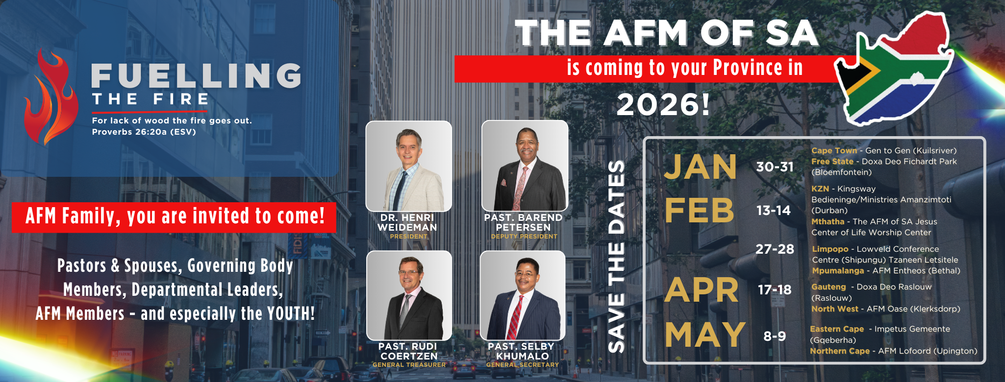 AFM stands for “Apostolic Faith Mission” (in Afrikaans: “AGS – Apostoliese Geloofsending“). The AFM exists since 1908 and is the first and largest Pentecostal church in the country – with 1.4 million members in SA and currently established in 28 countries of the world. “Pentecostal” means that it is a church who believes that the Spirit of God is given to believers to live dynamic and overcoming lives. It also implies that believers can demonstrate the character, love and power of their Lord, Jesus Christ, in their daily lives.