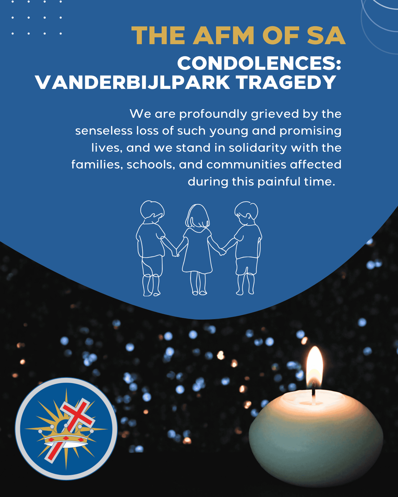 The Apostolic Faith Mission of South Africa (AFM of SA), speaking as both parents and pastors, expresses deep sadness and heartfelt condolences to the families who have lost their beloved children in the tragic accident in which twelve learners lost their lives on Monday, 19 January in Vanderbijlpark. We are profoundly grieved by the senseless loss of such young and promising lives, and we stand in solidarity with the families, schools, and communities affected during this painful time. Our thoughts and prayers are with them as they mourn an unimaginable loss.