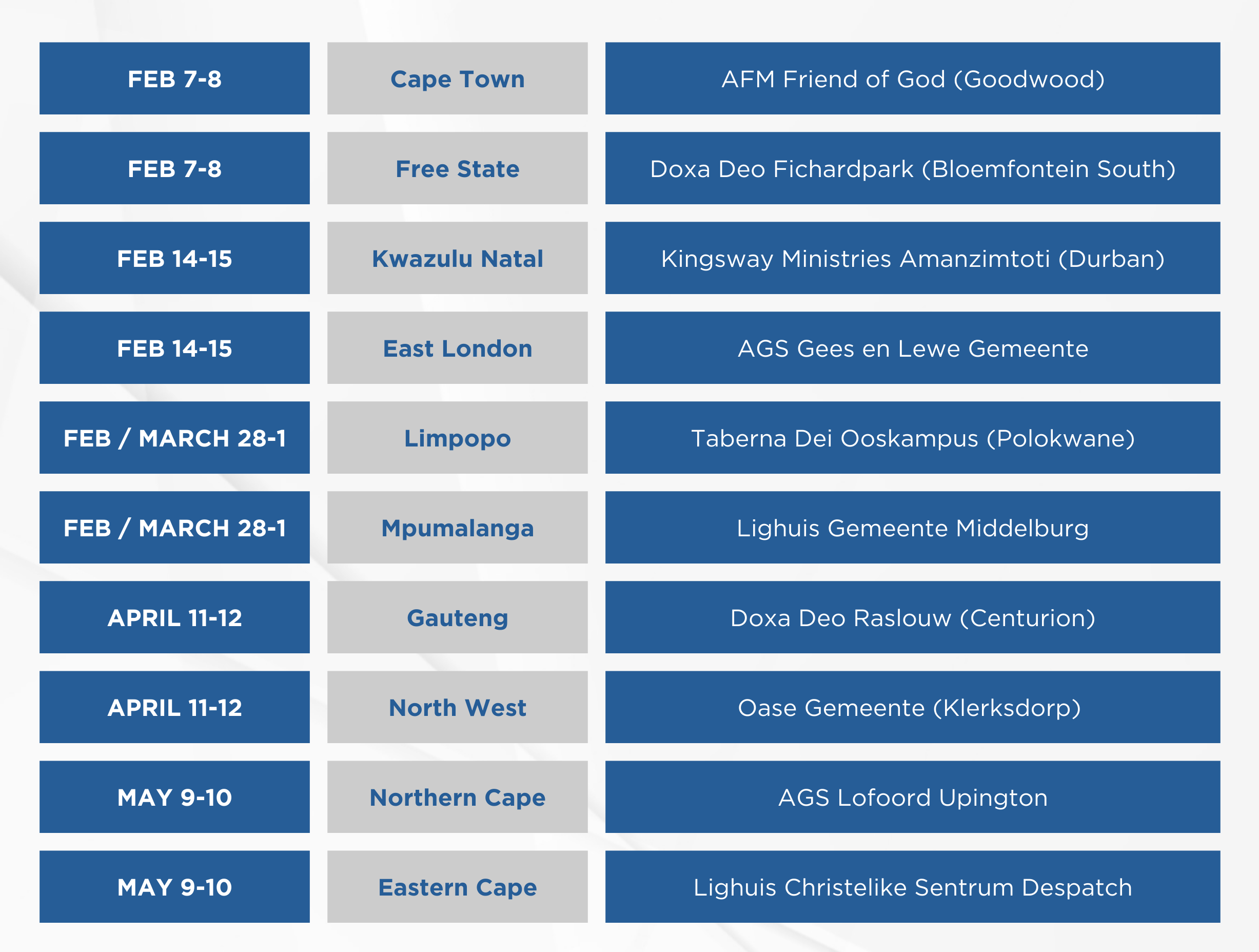 Neem asseblief kennis dat die datums en lokale vir die 2025 NOB Bemagtigingsbesoeke bevestig is:
