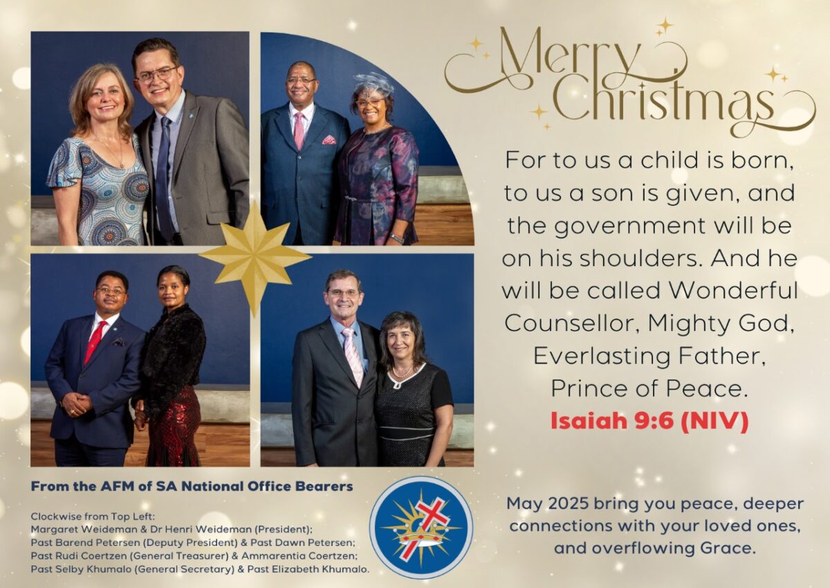 The AFM of SA dedicates the whole of January to Prayer and Fasting. There will be a focus week from 20-26 January 2025 with the theme "Seeking God’s Presence." During this week, the NOB, using short video clips, will call on believers to deepen their connection with the Lord by aligning their hearts to God’s will, trusting His guidance, and acknowledging Him in every decision.