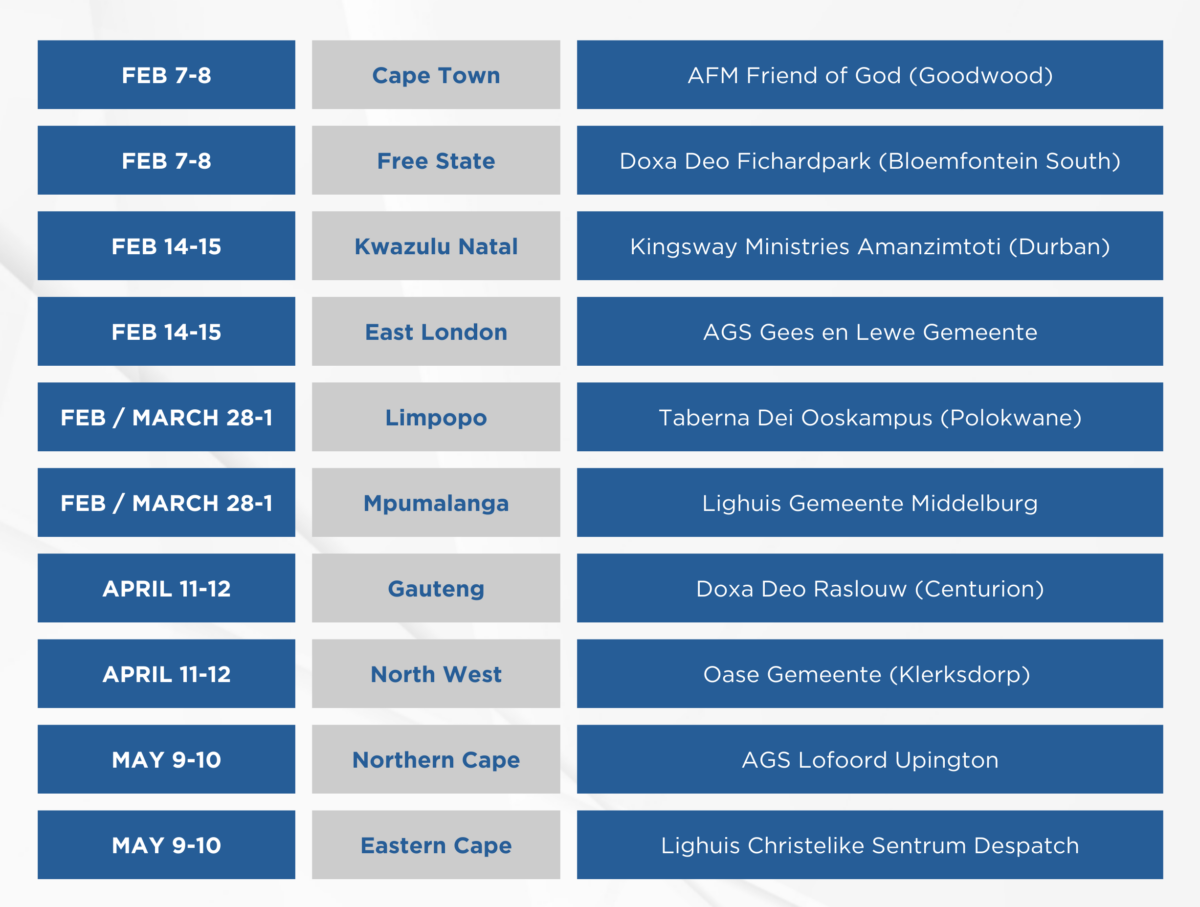 Daar sal ook 'n sessie spesifiek vir Pastore en hul gades wees. Dit sal fokus op die balansering van bediening en die alledaagse lewe. Maak asseblief seker dat jou skedule so beplan word dat jy deel sal wees van hierdie interaksie.