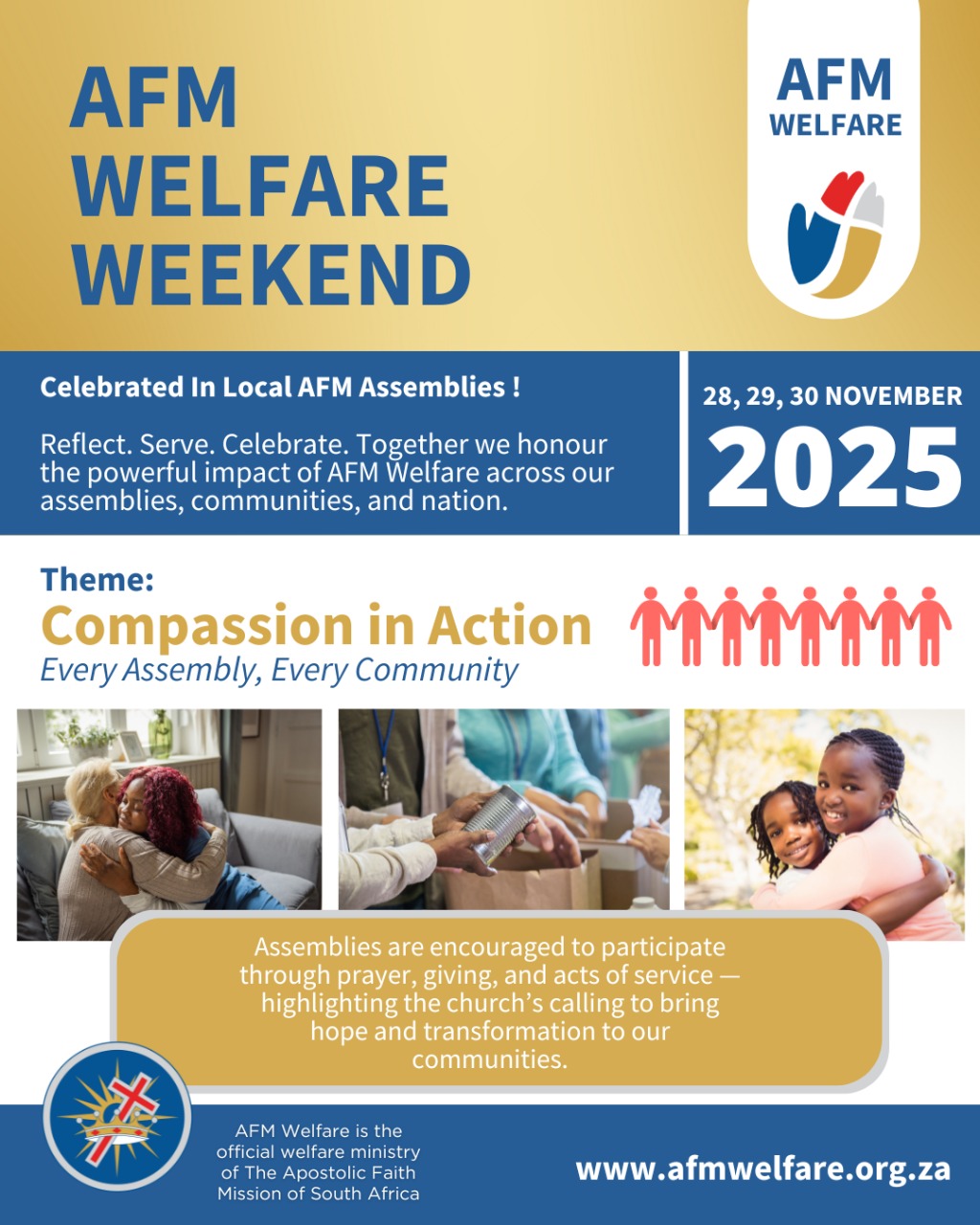 Ek moedig al ons Pastore en Gemeentes aan om aktief deel te neem aan vanjaar se AGS Welsynsnaweek. Ons tema, “Deernis in aksie” (Compassion in Action), herinner ons daaraan dat die versorging van mense nie net iets is waaroor ons praat nie - dit is iets wat ons prakties moet uitleef.