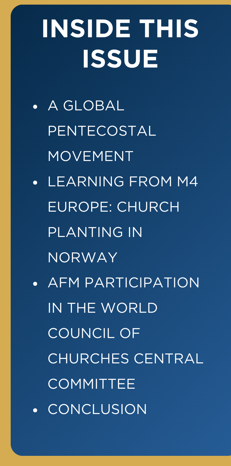 In this edition of the Pastoral Letter, we have requested Dr. Henri Weideman (President of the AFM of SA) to report and share his insights and reflections on the recent ecumenical outreaches of the AFM on international platforms. We trust that it will inspire and enrich your personal ministry efforts as we continue to share the Gospel and win souls for the Kingdom.