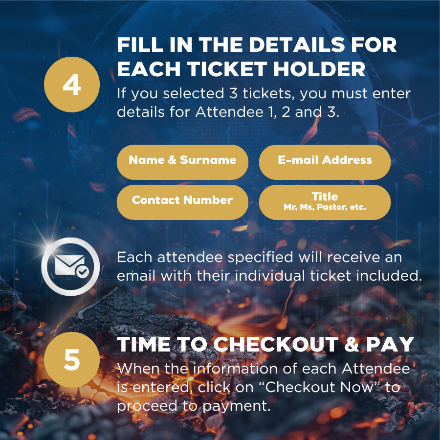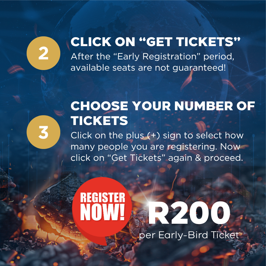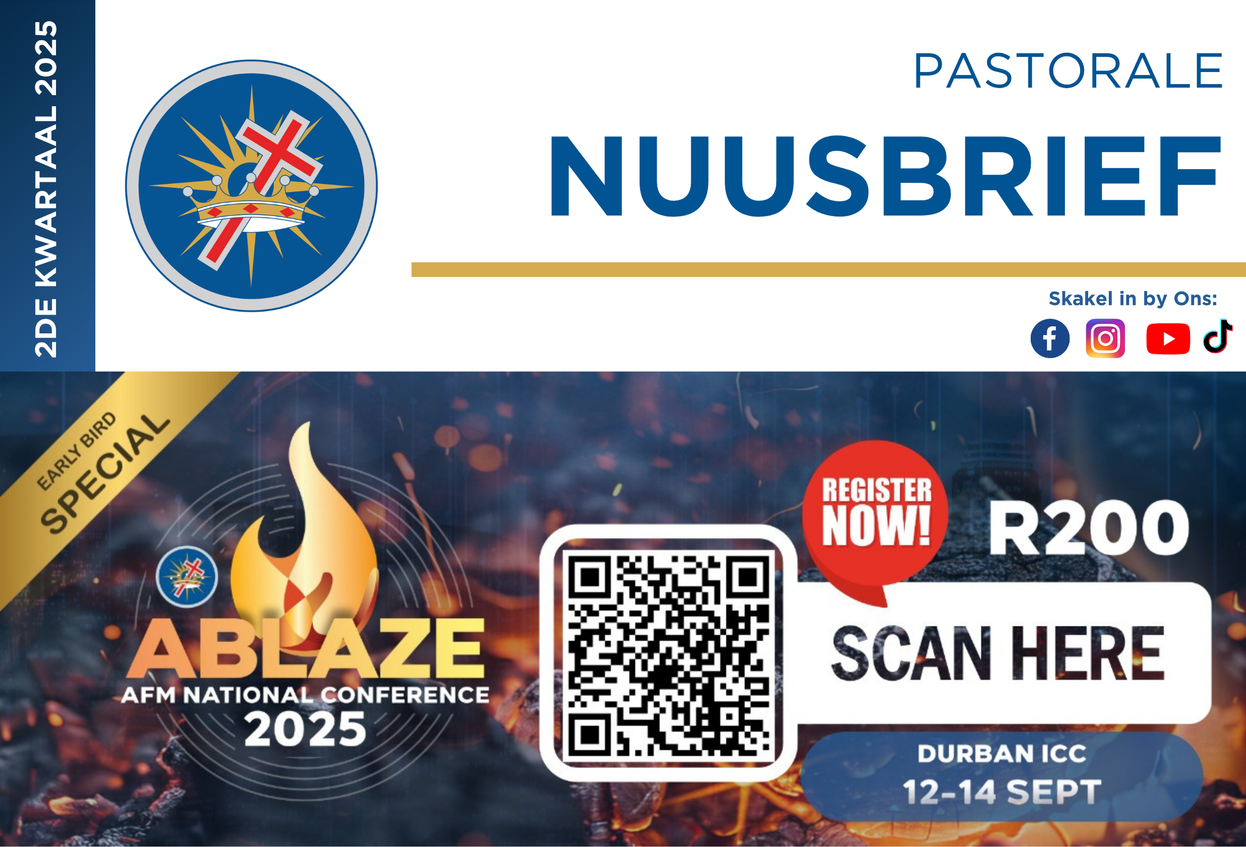 Vroeë registrasie vir die “AFM of SA ABLAZE” Nasionale Konferensie is nou oop! Moenie hierdie kragtige tyd van verfrissing, toerusting en Goddelike ontmoetings by die Durban International Convention Centre (ICC) misloop nie. Vroeë registrasie kos slegs R200 en is geldig vir 30 dae (9 Junie-9 Julie). Sitplekke is egter beperk. Verseker jou sitplek betyds en wees deel van dit wat die Here vir ons in stoor het.