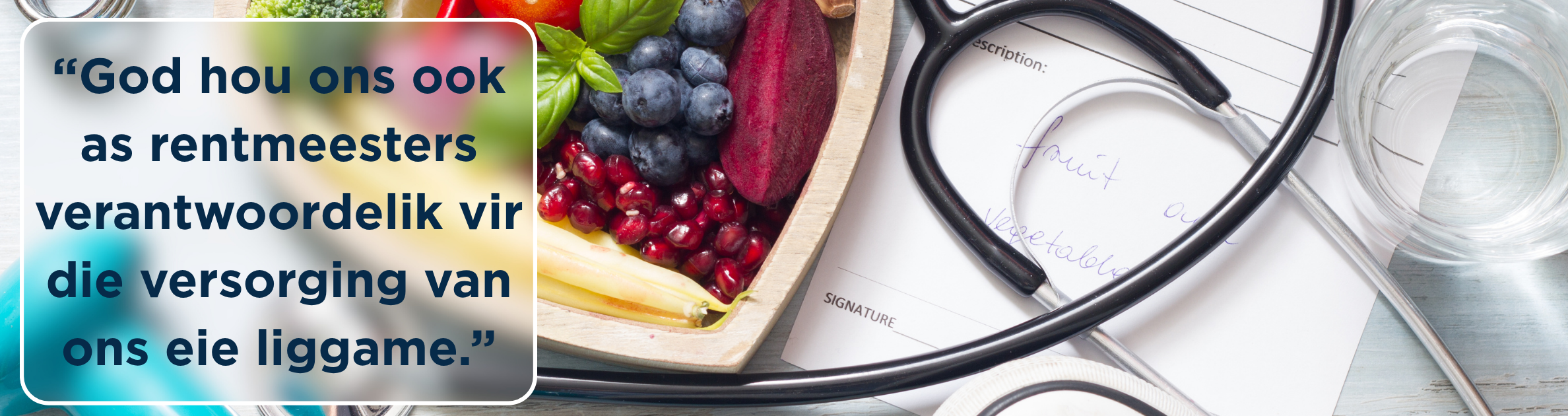 Oefen Gereeld: Streef na ten minste 20 minute se fisiese aktiwiteit 3 tot 4 keer per week. Voldoende fisiese aktiwiteit dra by tot groter effektiwiteit in die werk waartoe die Here ons geroep het. Eet Gesond: Vermy kitskos en ongesonde versnaperinge. Eet gesonde maaltye wat langdurige energie voorsien. Volgens 1 Korintiërs 10:31 moet ons God ook verheerlik deur ons eetgewoontes. Kry Voldoende Rus: Genoeg slaap en rus is belangrik. Psalm 127:2 herinner ons daaraan dat rus ’n gawe van God is en nie ’n teken van luiheid nie. Leef Gebalanseerd: Ons fisiese, geestelike en emosionele gesondheid is onlosmaaklik aan mekaar verbind.