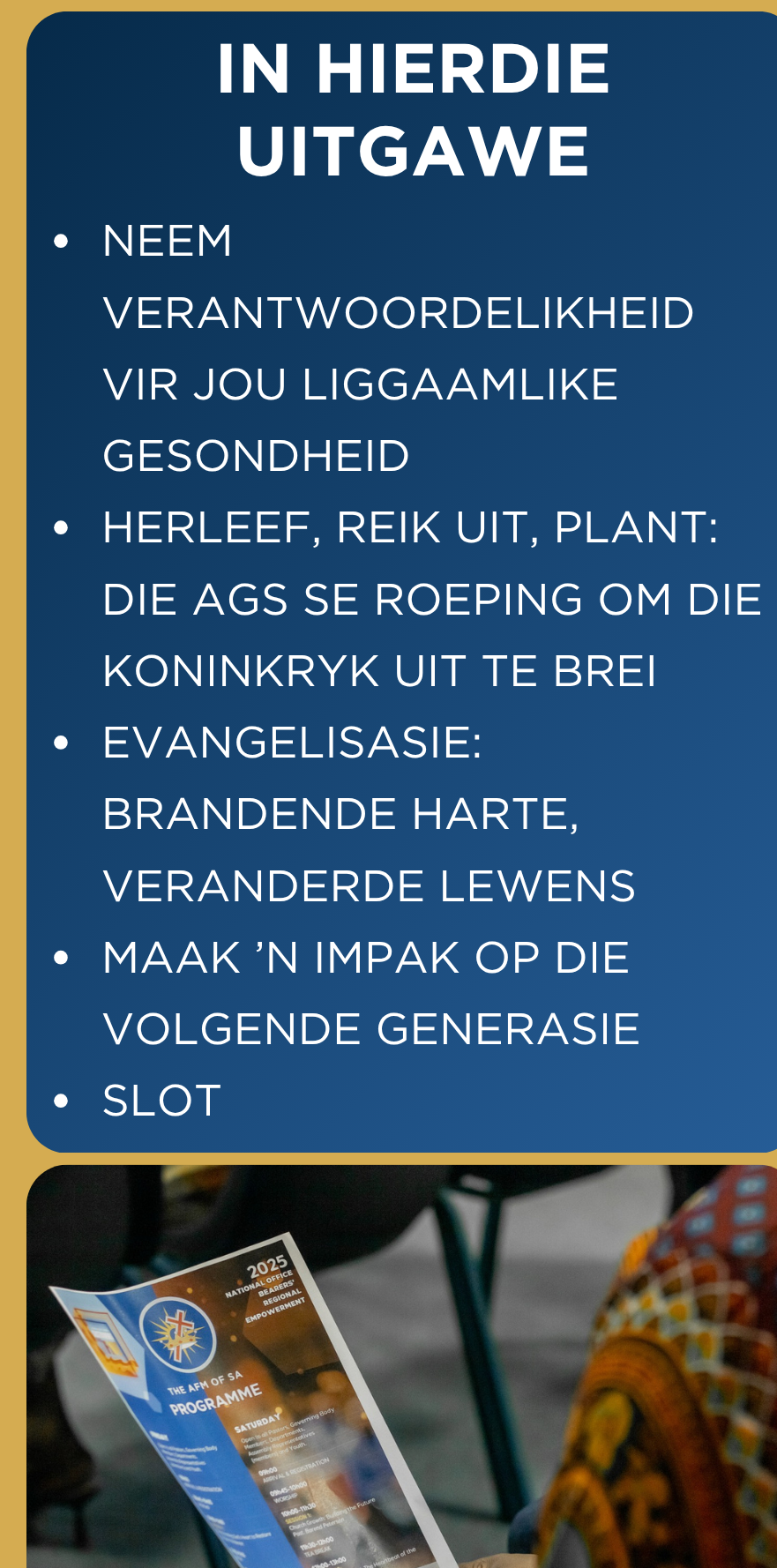 Vroeër vanjaar het ons Nasionale Ampsdraers die voorreg gehad om die verskillende streke te besoek en om kosbare tyd en bediening te deel met ons pastore, gemeenteleiers, lede van gemeentelike beheerliggame, departementele leiers en lidmate. Ons tema vir 2025 - “Sustaining the Fire” - het tydens ons besoeke sterk aanklank gevind. Dit het ons opnuut herinner hoe belangrik dit is om passievol en toegewyd te wees t.o.v die teenwoordigheid en werk van die Heilige Gees in ons lewens. Net soos wat ’n vuur deurlopend gestook moet word om brandend te bly, net so moet die geestelike vuur in ons lewens voortdurend aangehelp word deur ons gebede, aanbidding, die Woord en ’n lewe van gehoorsaamheid soos wat Romeine 12:11 (NIRV) ons leer: “Never let the fire in your heart go out. Keep it alive. Serve the Lord.”