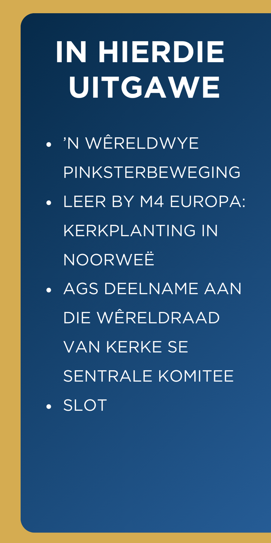 In hierdie uitgawe van die Pastorale Brief het ons vir Dr. Henri Weideman (President van die AGS van SA) gevra om verslag te doen en sy insigte en refleksies te deel oor die onlangse ekumeniese uitreike van die AGS op internasionale platforms. Ons vertrou dat dit jou persoonlike bediening sal inspireer en verryk terwyl ons saam voortgaan om die Evangelie te deel en siele vir die Koninkryk te wen.